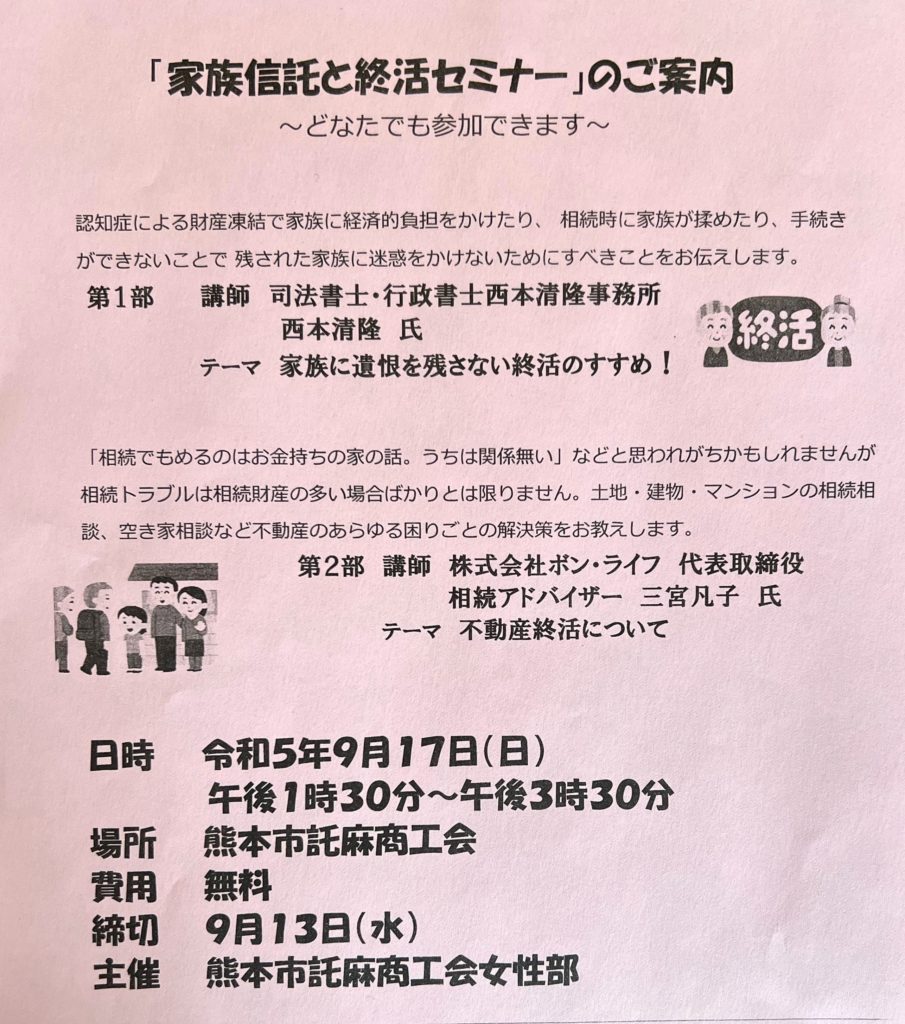 来月9月17日(日)に「家族信託と終活セミナー」にボンライフ代表 三宮 が講師としてお話をします!!!!!!!!!!!!