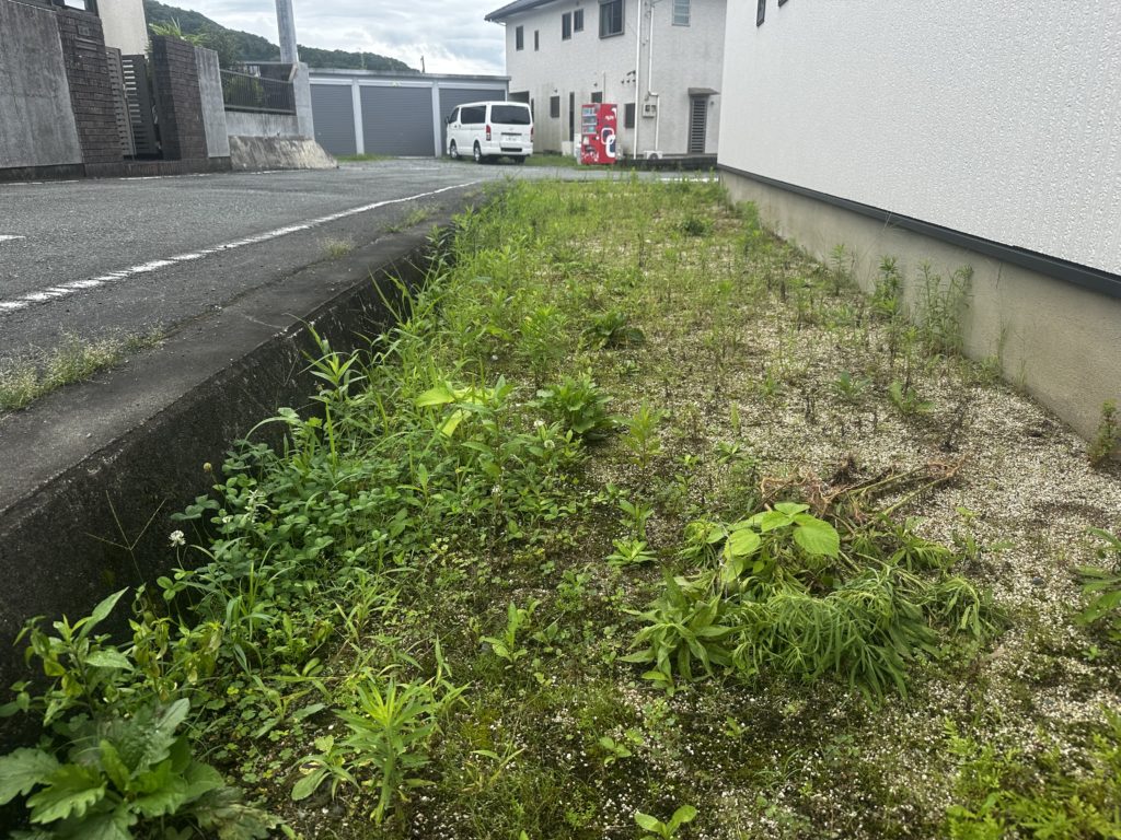 まずはビフォーの写真をご覧ください。雑草が生い茂っていました。この状態では、物件の魅力が十分に伝わりません。