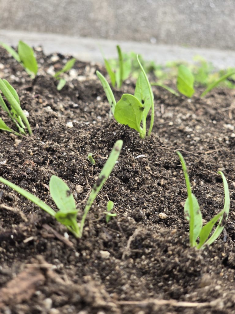 芽が大きくなり始めたことで、そろそろ間引きのタイミングがやってきました。間引きは、土壌の栄養を有効活用し、ほうれん草が大きく健康に育つための重要なステップです。密集している部分を慎重に間引き、周囲との距離を確保するよう心掛けています。