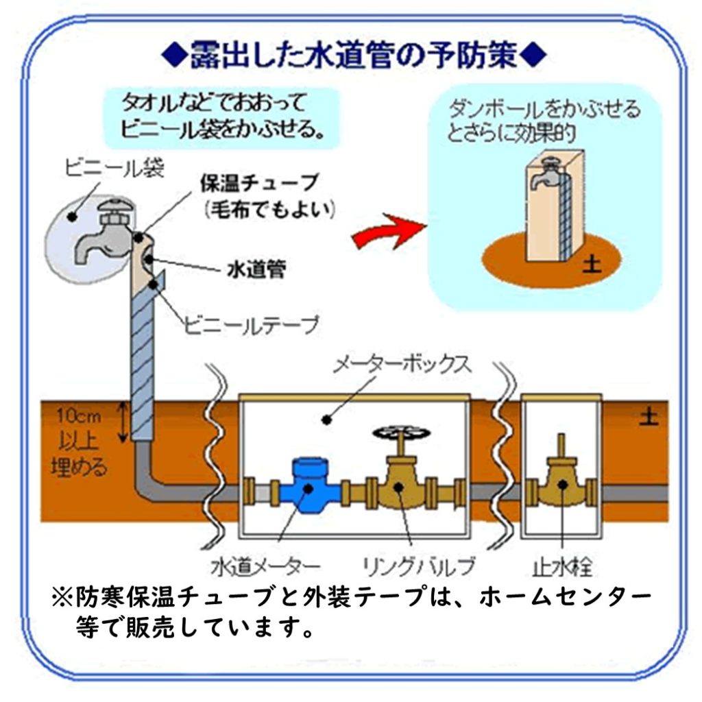 屋外に露出している水道管は、タオルや保温チューブなどを巻いて保温してください。